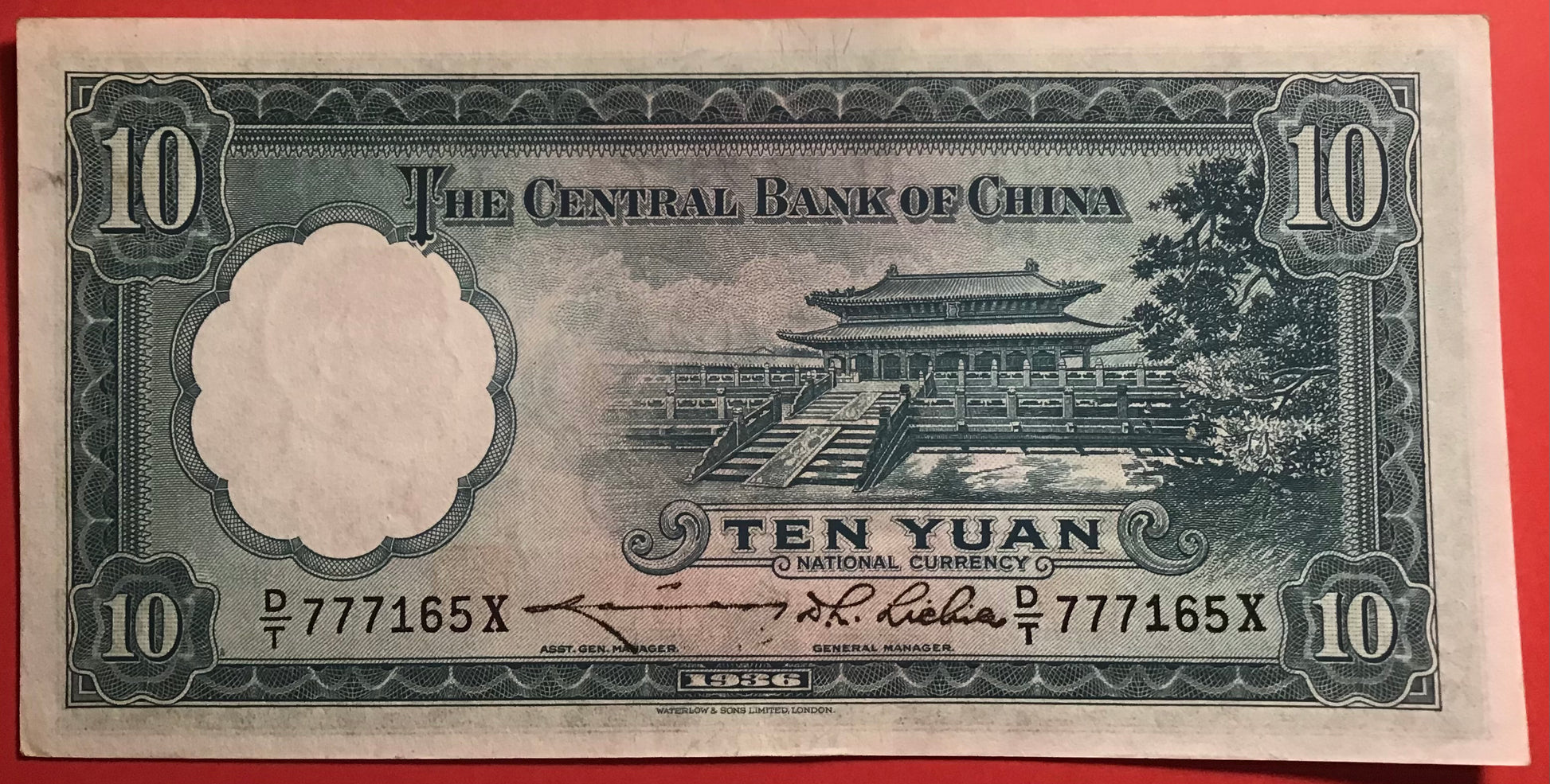 China - 10 Yüan 1936 P#218d Kvalitet 01