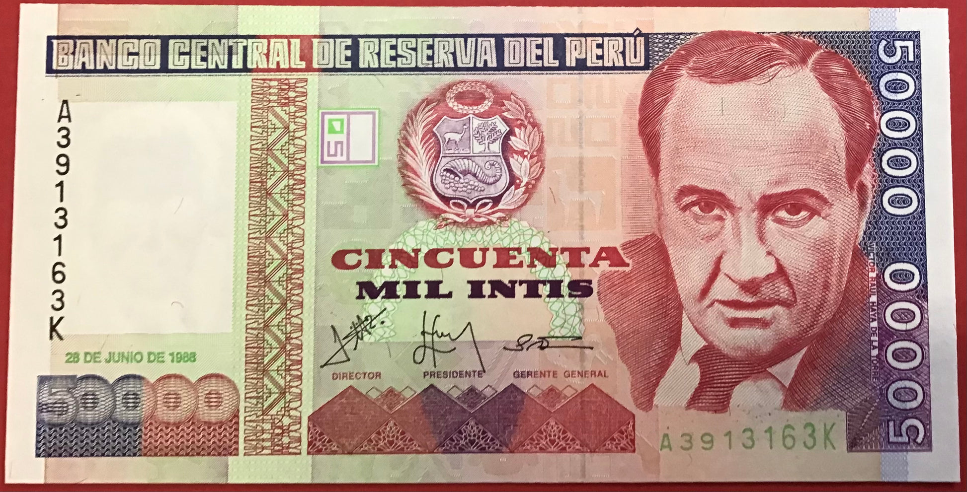 Peru - 50.000 Intis 28.6.1988 P#142 Kvalitet 0