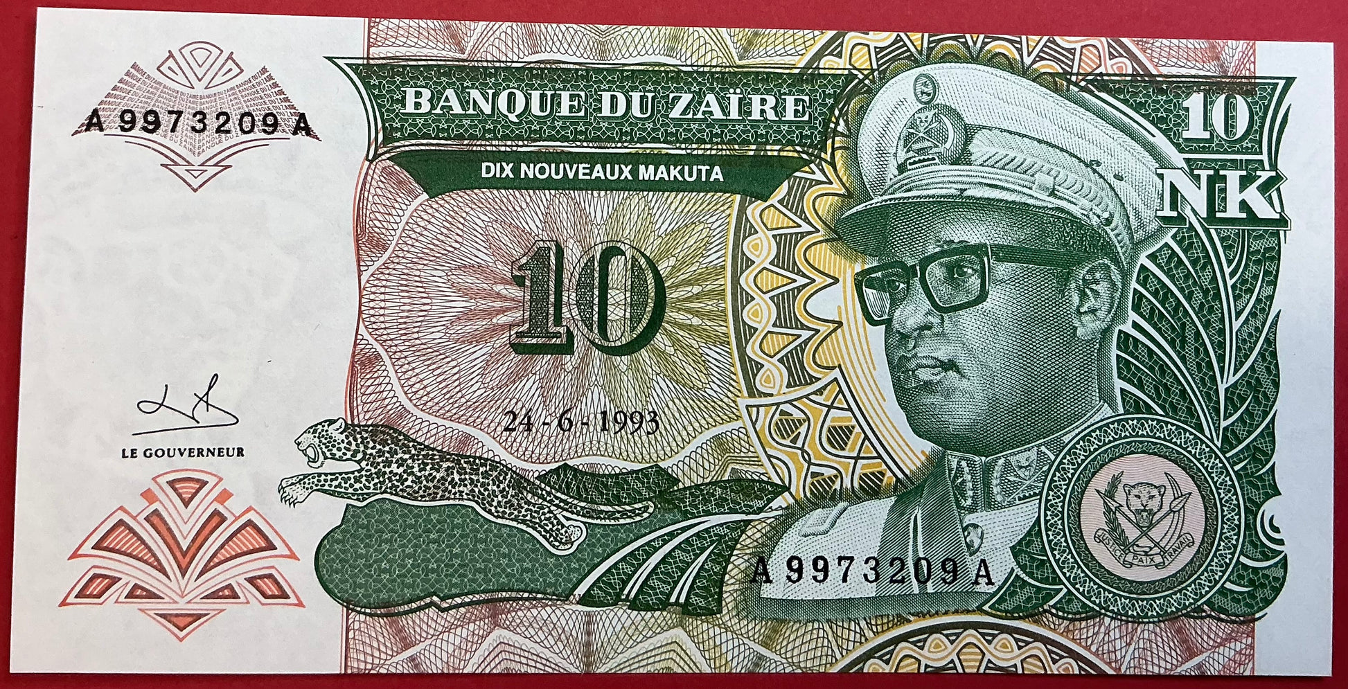 Zaïre - 10 Nouveaux Makuta 24.6.1993 P#49 Kvalitet 0